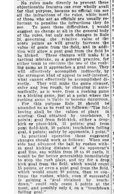 As far as I can tell, Thompson’s proposal for dramatically higher point values for field goals did not receive serious consideration by the committee, though a Christmas Day 1905 test game in Wichita monitored by the rulemakers valued field goals by distance: