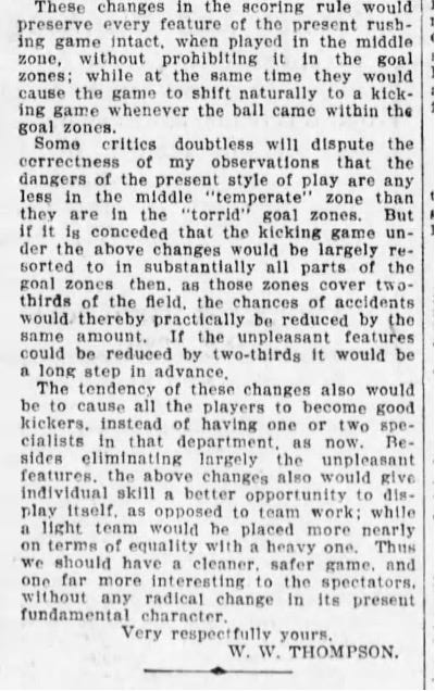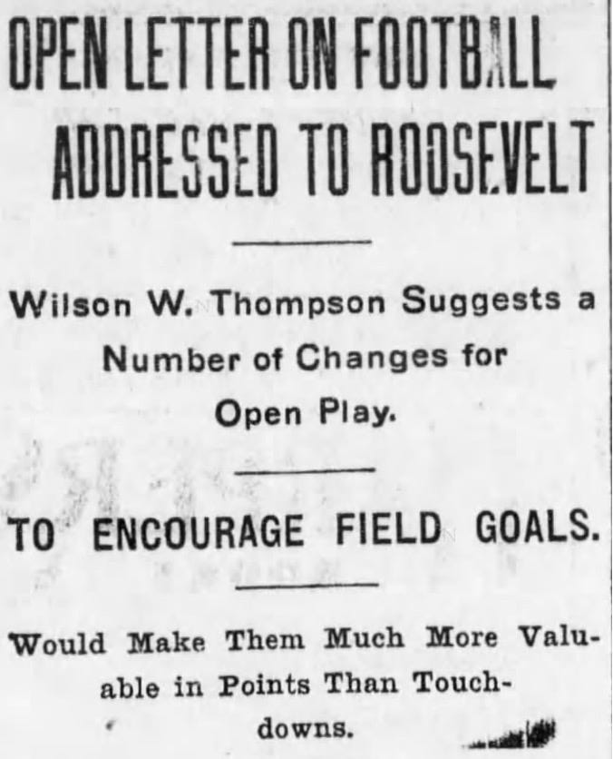 I haven’t seen evidence that Thompson was involved in the football rulemaking process through the University Club, but he had radical ideas for change that he documented in an open letter to President Theodore Roosevelt in December 1905. everal New York newspapers printed the full letter, and summarized versions appeared in newspapers nationwide.