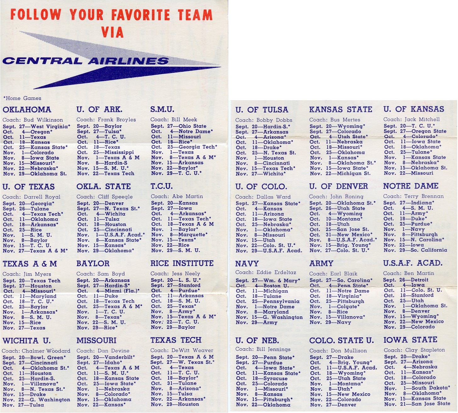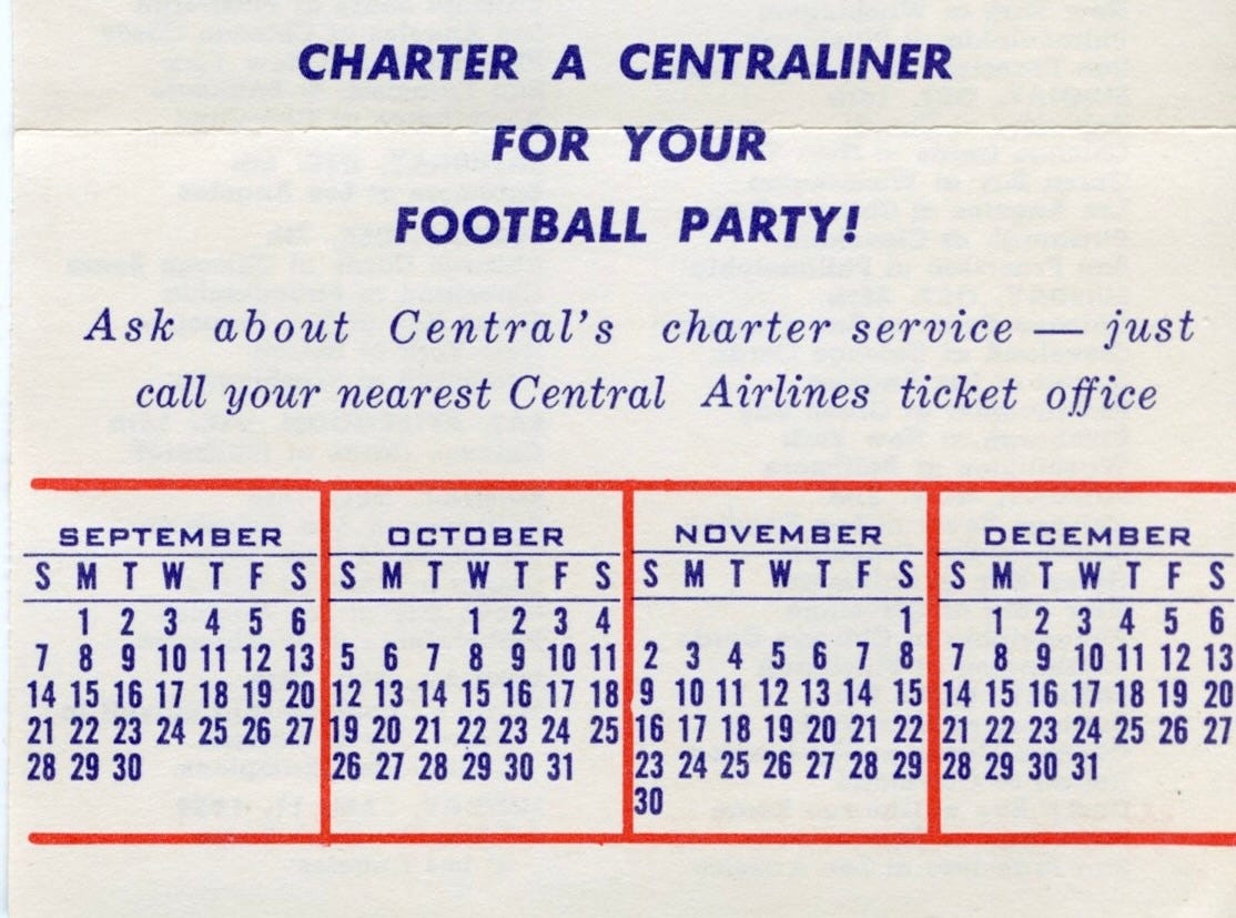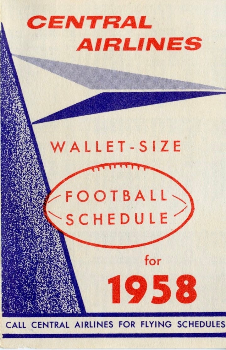 Central’s 1958 schedule focused on teams in the old Southwest and Big Eight conferences, regional teams like Denver and Wichita, as well as Notre Dame and the service academies, so their focus was regional since that was the nature of most airlines at the time.