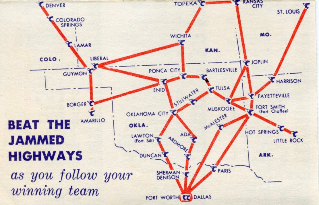 Originating in Fort Worth, Central served 25 cities in Texas, Oklahoma, Arkansas, and Kansas before adding a route to Norman in 1951, which allowed them to offer a 25 percent discount to fans flying in and out of Norman on game day.
