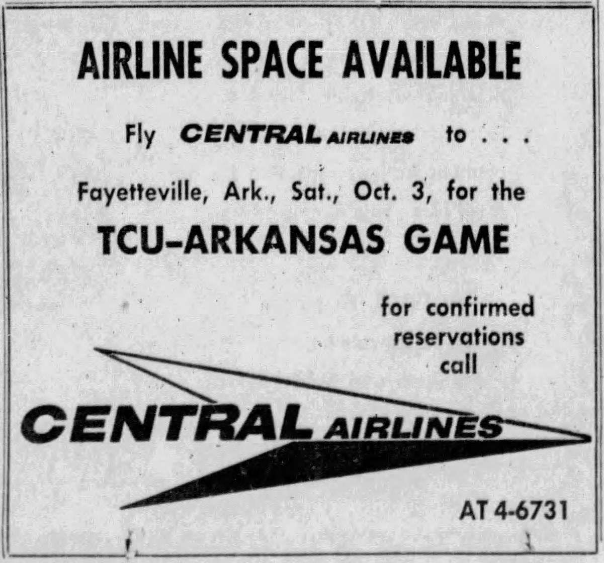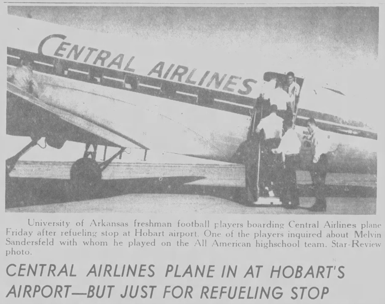Airlines like Central also flew teams to games via charter and commercial flights, and sometimes both. A 1959 story covered a Central Airlines charter flight carrying Arkansas’ freshmen team making a fuel stop in Hobart, Oklahoma, while on their way to Texas Tech, which, apparently, was big news in Hobart.