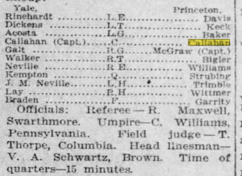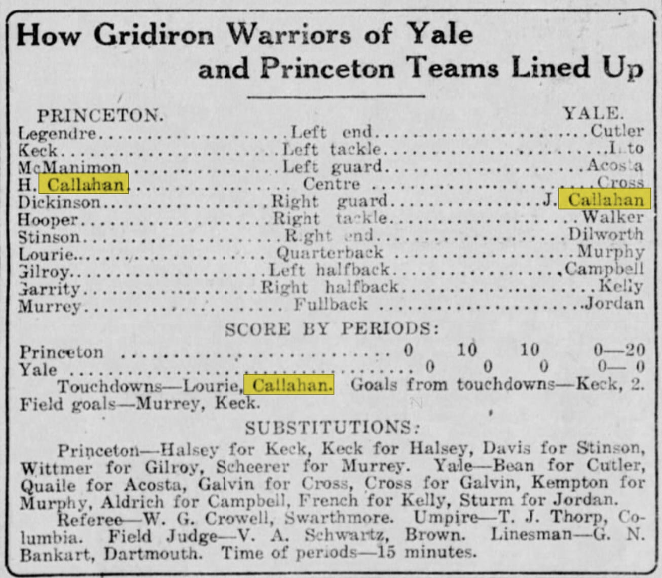 Just before the whistle blew, Captain Tim Callahan of Yale and Mike Callahan of Princeton walked out into the middle of the gridiron. The referee said: "I guess I don't have to introduce you boys," and he was quite right, because the Callahans are brothers.