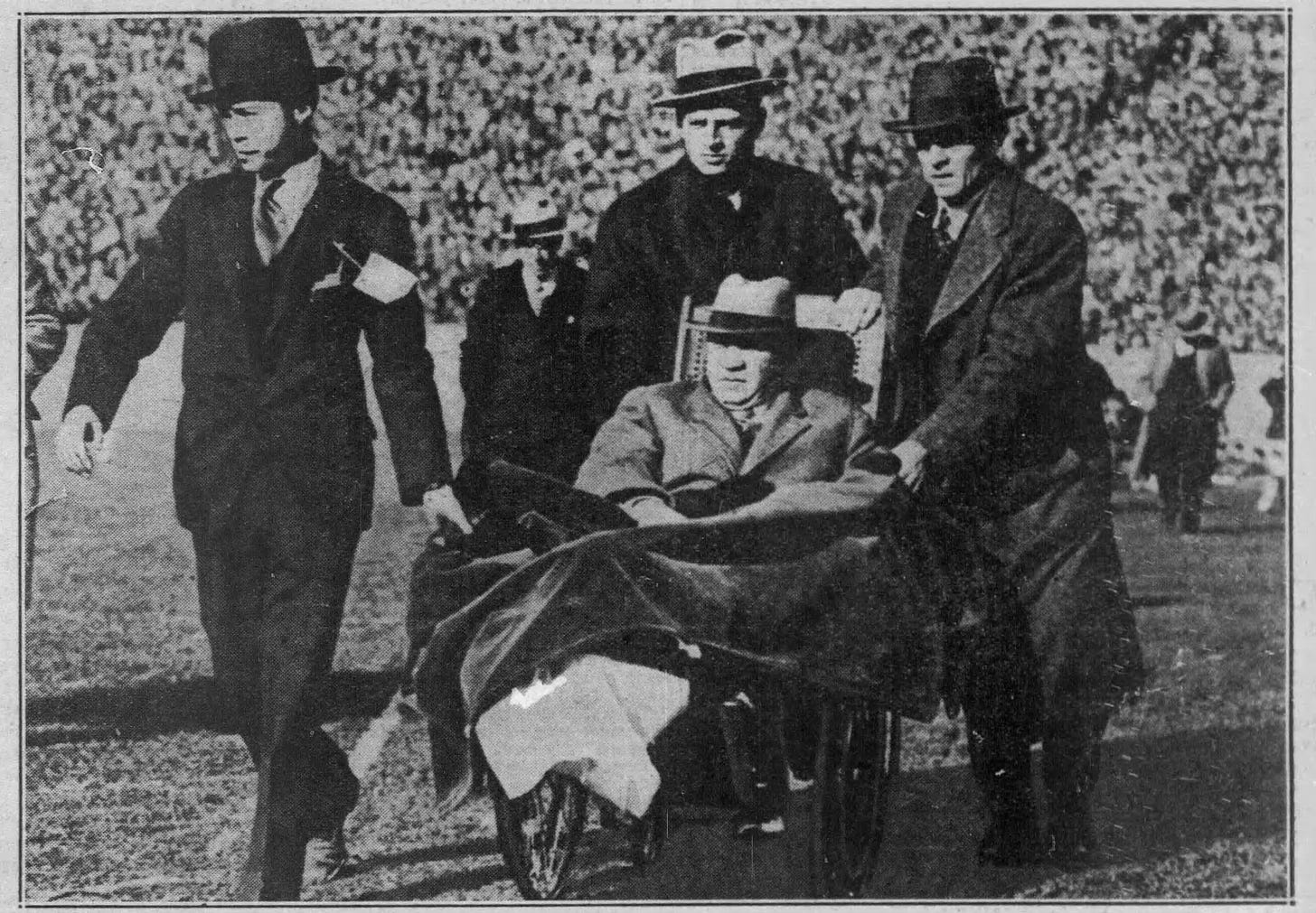 Knute Rockne, who suffered from phlebitis, dealt with his disability by coaching from a wheelchair or an automobile with a loudspeaker device.