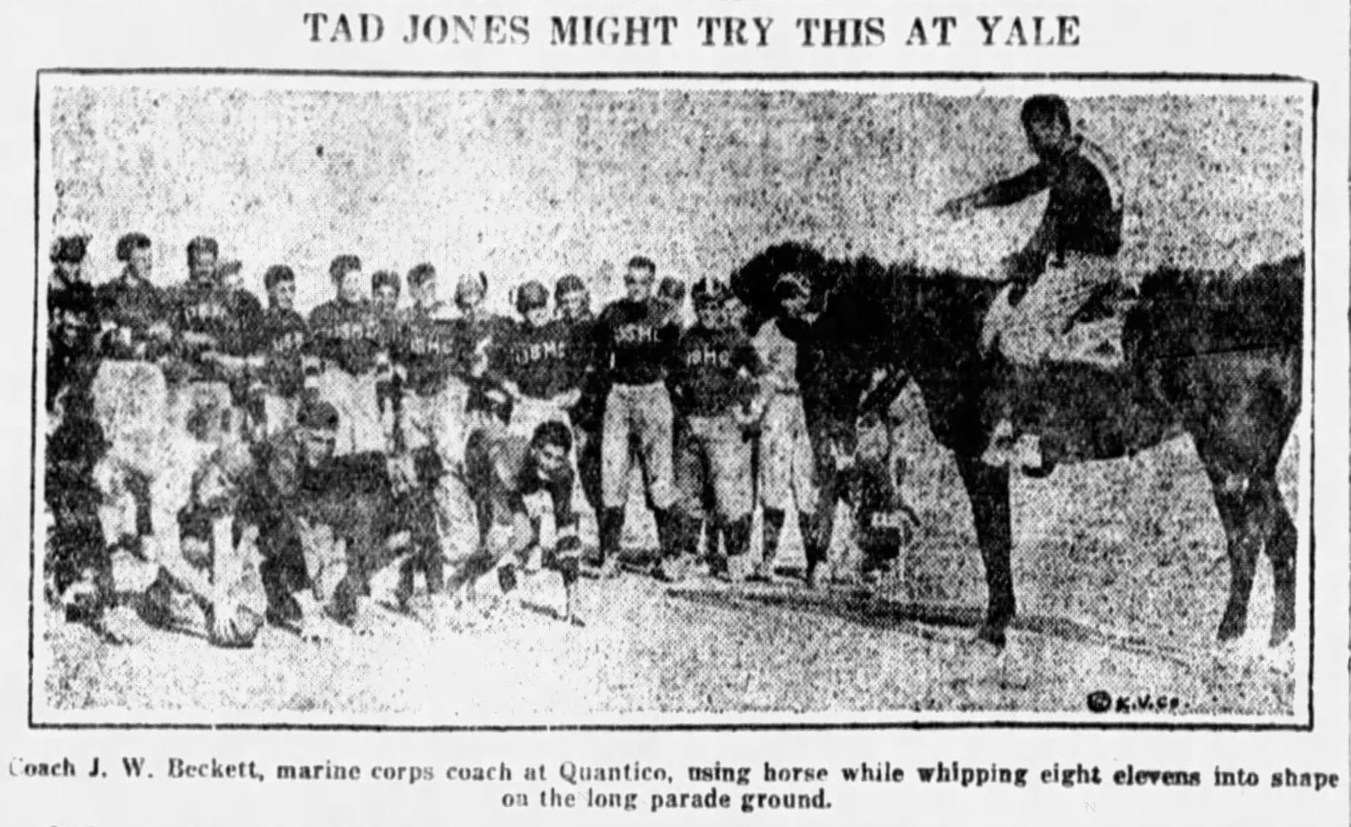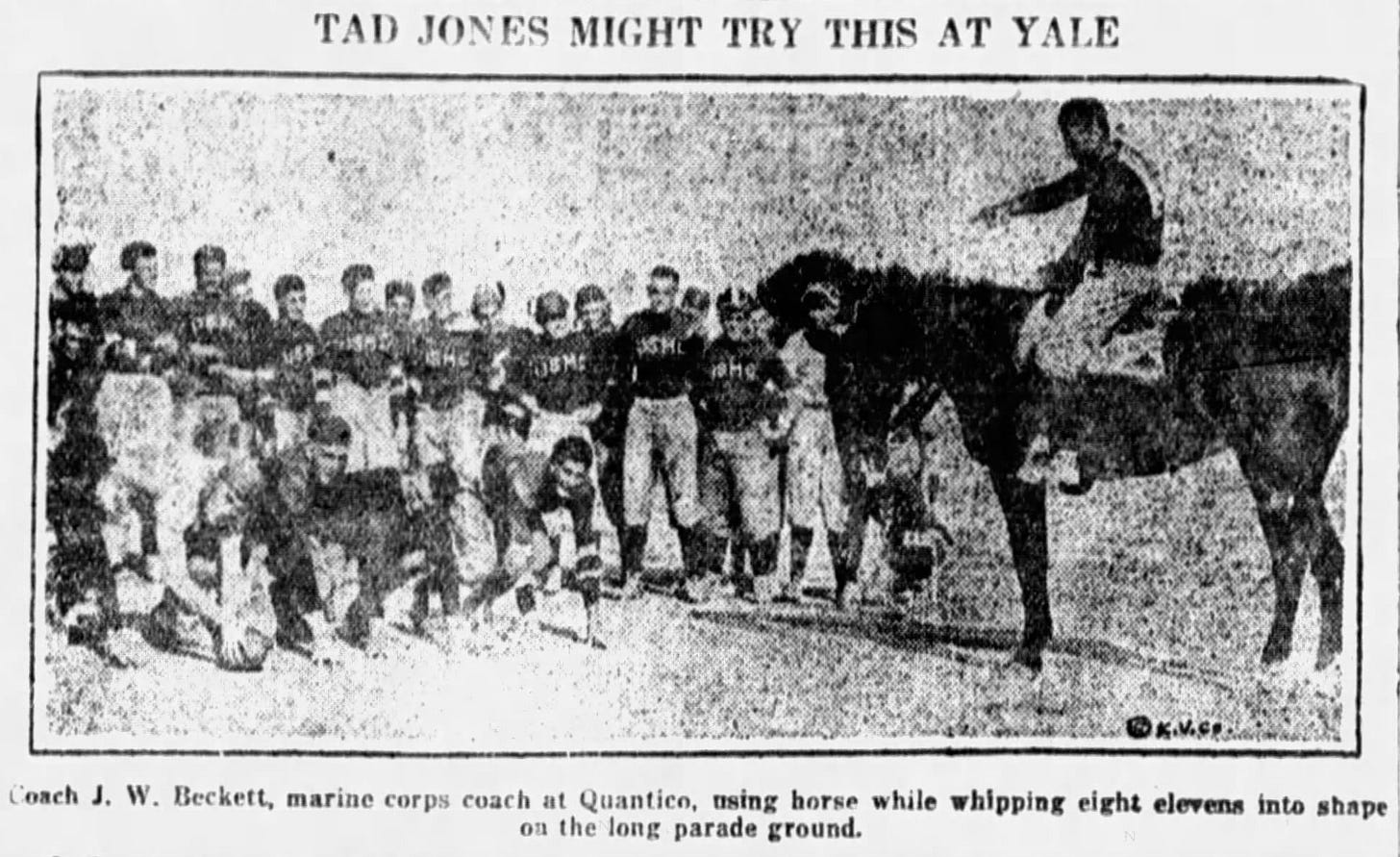 Captain John Beckett used a similar tactic at Quantico in 1922. Beckett, who captained Oregon in the 1916 Rose Bowl and the Marine Island Marines in the 1918 Rose Bowl, coached eight different Marine teams spread across Quantico’s mile-long parade ground. Rather than walk or run from team to team, Beckett also went the horseback route.