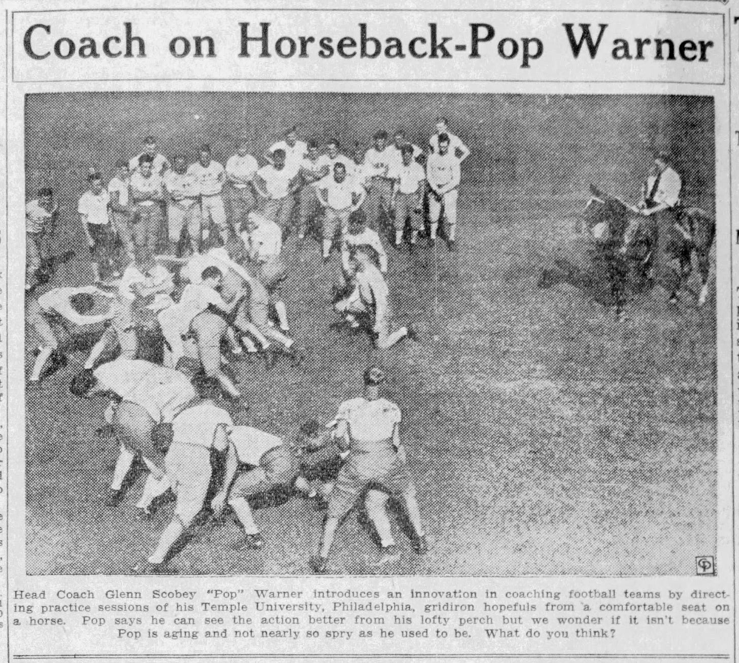 After 40 years of coaching, Pop Warner sometimes tired. To rest his weary legs during his final head coaching stint, Warner rode a trusty steed when mentoring the Temple Owls.