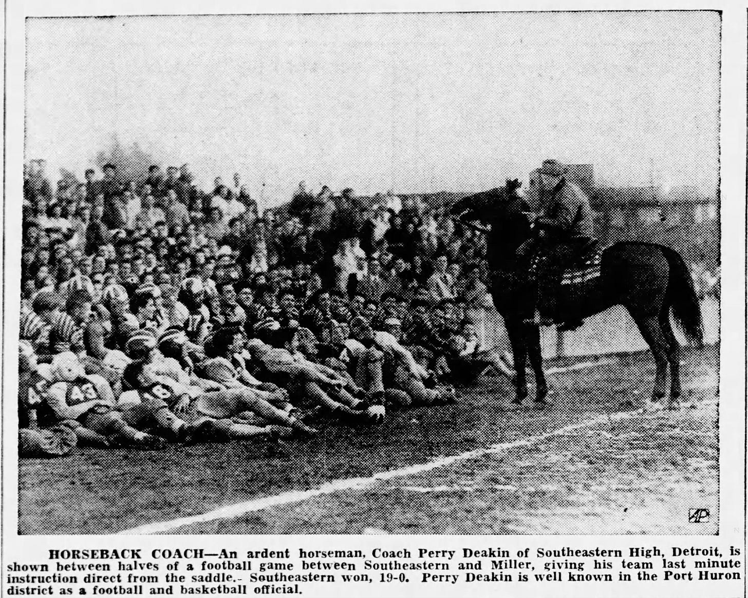 Finally, there was Perry Deakin, the coach at Southeastern High in Detroit. The coaches mentioned previously used a horse or machine for conveyance due to injury or the physical distance between the teams they supervised. However, Detroit Southeastern High’s Perry Deakin seems to have really liked horses, so he occasionally busted a bronco, including at halftime of their 1945 game with Miller High.