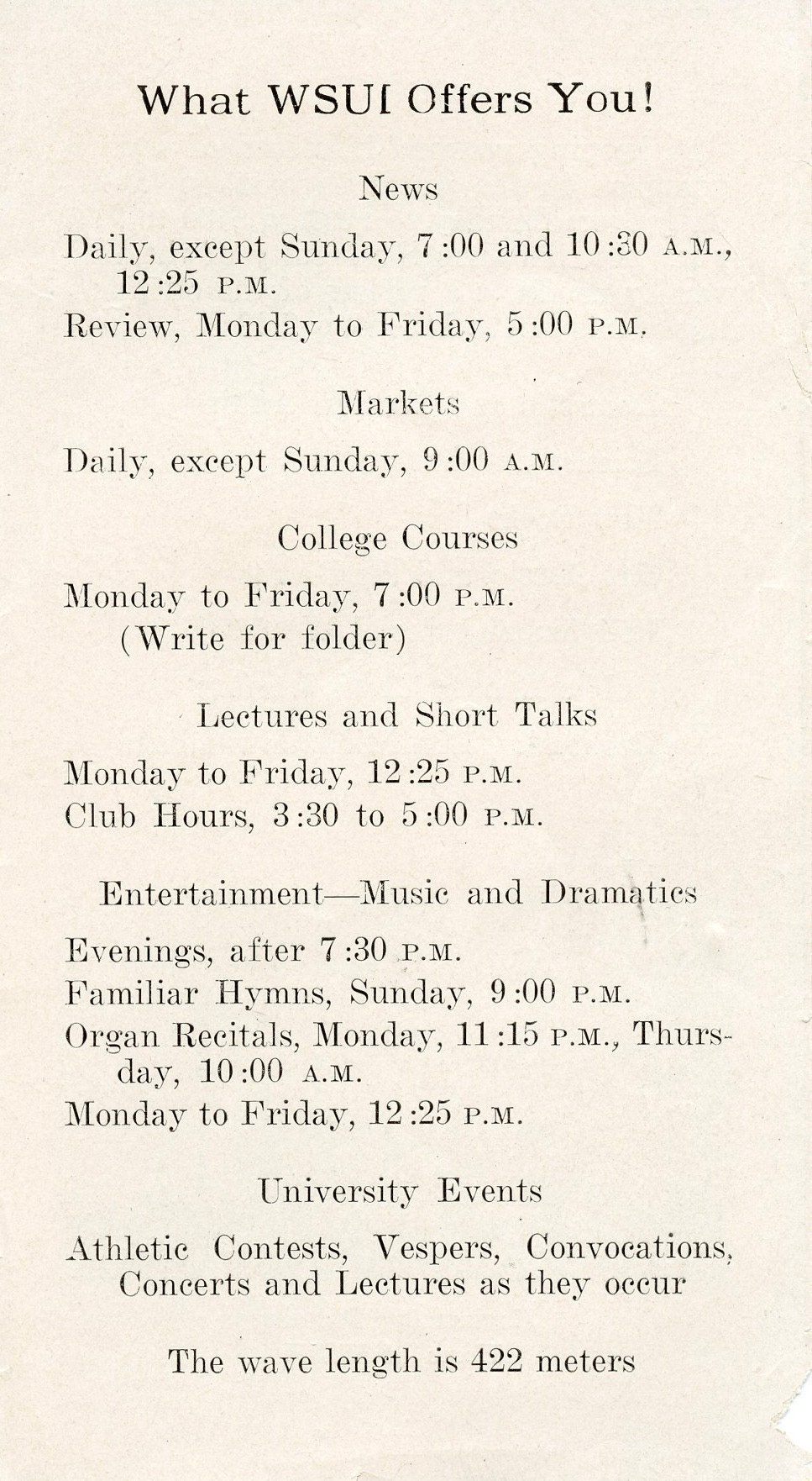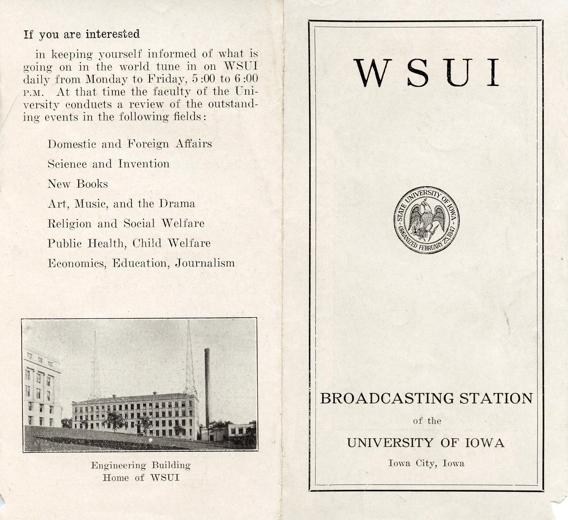 The programming noted in the WSUI pamphlet matches those mentioned in newspaper articles in 1925 and 1926, so the pamphlet is from one year or another.