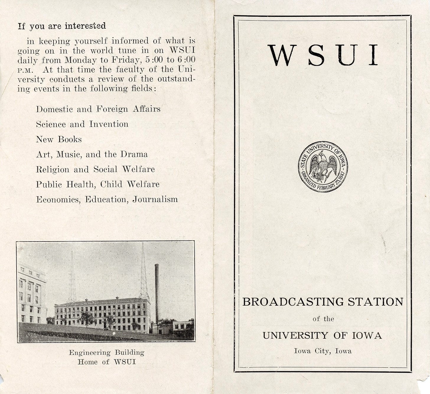 One way to examine those relationships is through documents that show the interplay at some time. Period documents are like insects trapped in drops of amber in that they do not change over time. One example of documental amber is the following brochure from 1925 or 1926, published by radio station WSUI.