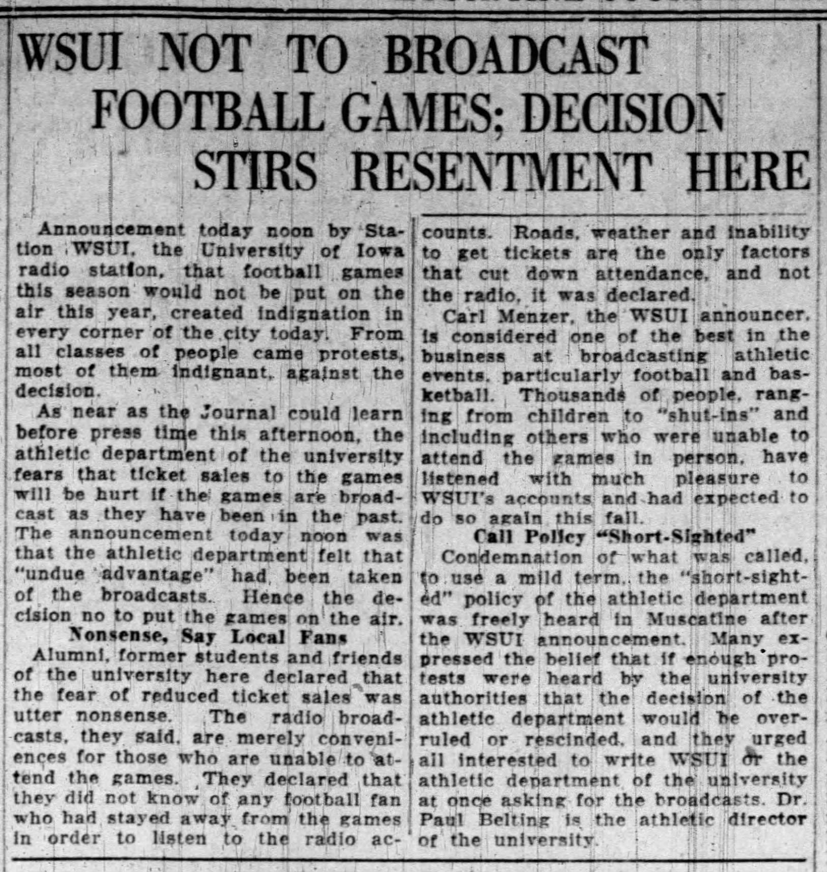 The popularity of football radio casts was not without problems. It was not that they were unpopular; they became too popular, which led to concerns about their impact on game attendance and ticket sales. Since Iowa's Athletic Department was self-funded and football ticket sales dominated their revenues, the Athletic Department pressured the Engineering Department to suspend their football broadcasts.