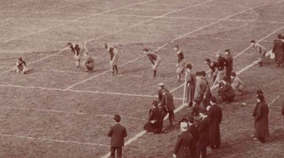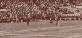 The field is marked in a partial checkerboard during the only season with those markings. (The field was a gridiron in 1902 and again in 1910. Between 1904 and 1909, the checkerboard covered the entire field.) The 55-yard line intersects with the batter's box, but the most interesting aspect of the field markings are the sideline and goal line extensions near the bottom of the image. These identify the "touch in goal" area in each corner. (The “touch in goal” area will be covered in tomorrow’s Tidbit covering 1876 IFA Rule #21.)