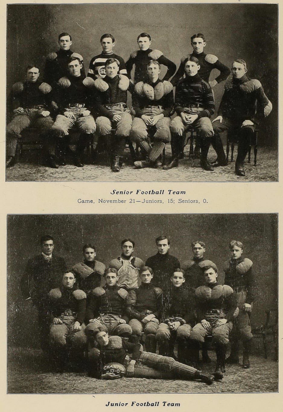Back then, the varsity played other schools or athletic clubs while the class teams played one another. Since many students had limited money, the class team players might borrow the football equipment of varsity players rather than buy equipment of their own. That appears to be the case here based on the images of the senior and junior teams.