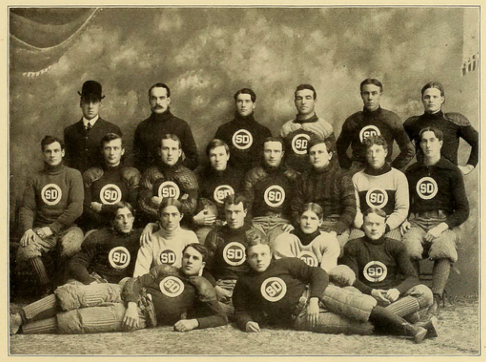 However, the SD logos were largely a thing of the past in 1903. Only one player wears the logo, and another appears at the image's bottom. More interesting are their shoulder pads. Seven or so wear consistent-looking pads, others wear leather pads, and there’s a guy on the floor to the left with a sternum pad. My favorite is the guy seated to the far left with standard shoulder pads and two others protecting his collarbones.