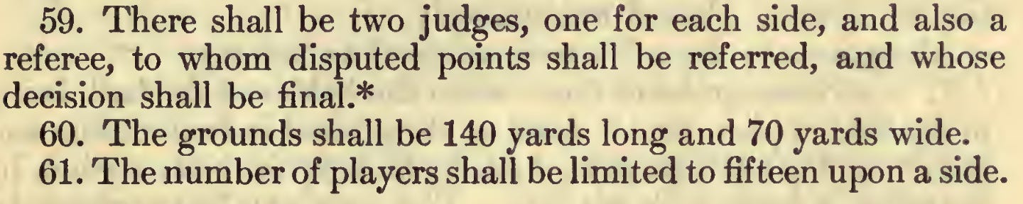 America’s early rugby or football players thought rugby’s rules lacked specificity, so while the Inter-Collegiate Football Association adopted most of the 1876 Laws of Rugby verbatim, it modified and added a few. Among the additions was Rule 60, which defined the field as 140 yards long and 70 yards wide, which means they specified the American football field before the RFU defined its field.