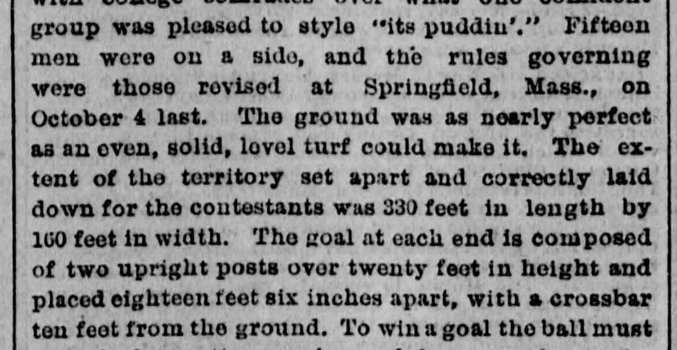 A New York Daily Herald article covering the November 1879 Yale-Princeton game states that they played on a field measuring 110 yards by 160 feet.